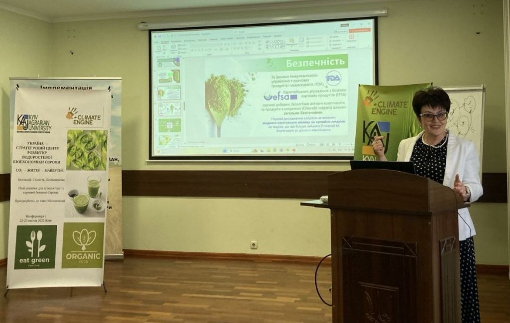 Професор кафедри харчових технологій Людмила Пешук та асистент кафедри Ольга Кожемяка взяли участь у Першій міжнародній науково-практичній конференції «Україна – стратегічний центр розвитку водоростевої біоекономіки Європи: CO₂ → Життя → Майбутнє», що відбулася 22 квітня 2026 року на базі Київського аграрного університету НААН України. Конференція об’єднала провідних українських та міжнародних учених для обговорення перспектив розвитку водоростевої біоекономіки, інноваційних біотехнологій і сталого розвитку аграрного сектору.