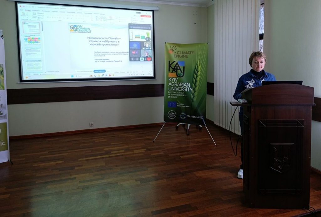 Асистент кафедри Ольга Кожемяка представила на конференції доповідь «Хлорела: зелена відповідь України на клімат і продовольство», присвячену сучасним підходам до використання мікроводорості хлорели в агровиробництві, функціональному харчуванні та екологічних технологіях. У межах виступу було акцентовано на потенціалі мікроводоростей як інструменту поглинання CO₂, підвищення продуктивності біосистем і розвитку інноваційної біоекономіки.
